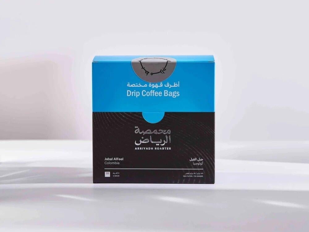 خمسة أظرف مميزة بتصميمها العملي، يحتوي كل منها على 15 جرام من قهوة (جبل الفيل) الكولومبية بإيحاءاتها المميزة بين حلاوة الشوكولاتة و الفواكة الحمراء و حموضة البرتقال والمكسرات.